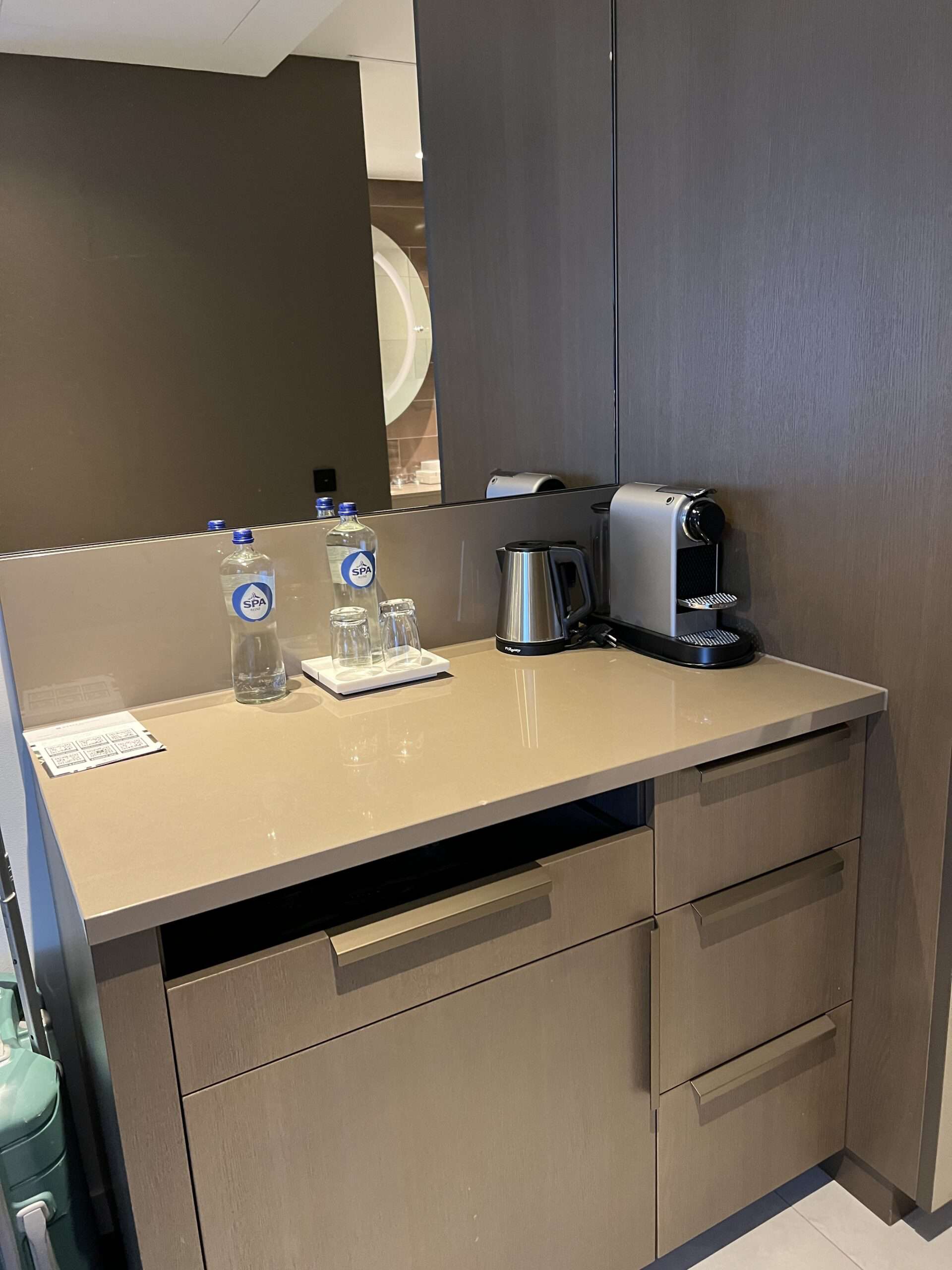 The rooms included a flat screen TV, desk, bottled water, dresser drawers, and a nice closet. The closet held two suitcases, which freed up space in the room. It was also nice to have two large water bottles to start and end the day. Overall, it was a fantastic room for our family.